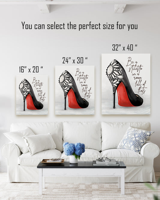 Be A Stiletto In A Room Full Of Flats - Shoes Fashion Quote Wall Decor Art Print on a light gray background - unframed artwork printed on canvas