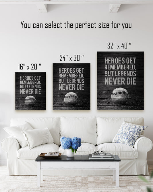 Heroes Get Remembered Legends Never Die - Baseball Motivational Sports Quotes - Baseball Wall Art for Boys Bedroom, Baseball Coach Gift - Inspirational Baseball Wall Decor