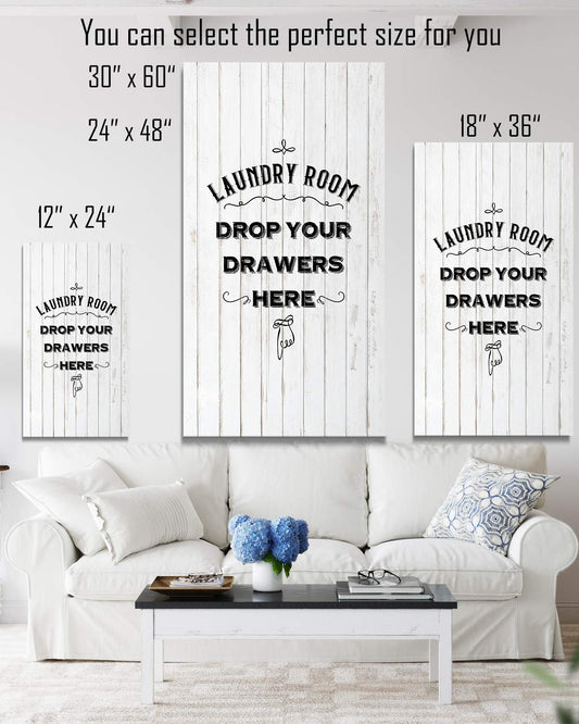 Laundry Room Drop Your Drawers Here - Wall Decor Art Canvas on a white woodgrain background - Ready to Hang - Great for a laundry room or kitchen