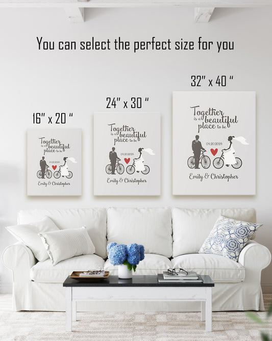 Together Is A Beautiful Place To Be - Customizable Wall Decor Canvas Art for cycling fans on a light gray background - Great gift for a wedding or anniversary