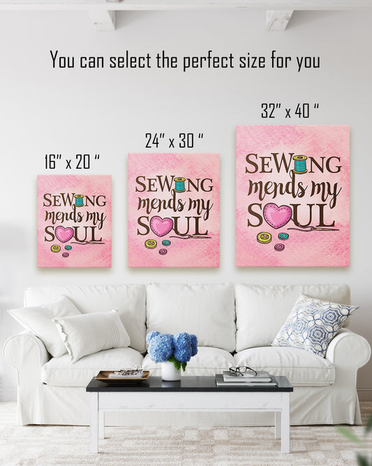 Sewing Mends My Soul - Sewing Wall Art Decor Print with a pink background - Poster & Canvas Sizes